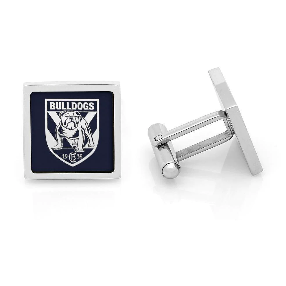 That's My Team! Show your support for the Canterbury Bulldogs on your cuff. These Bulldogs cufflinks are the official product, licensed by the NRL and come in a classy black box featuring the NRL logo embossed in silver. A perfect present for a Bulldogs fan.Measures 17x17mm, Enamel Silver Rhodium Plate finish.