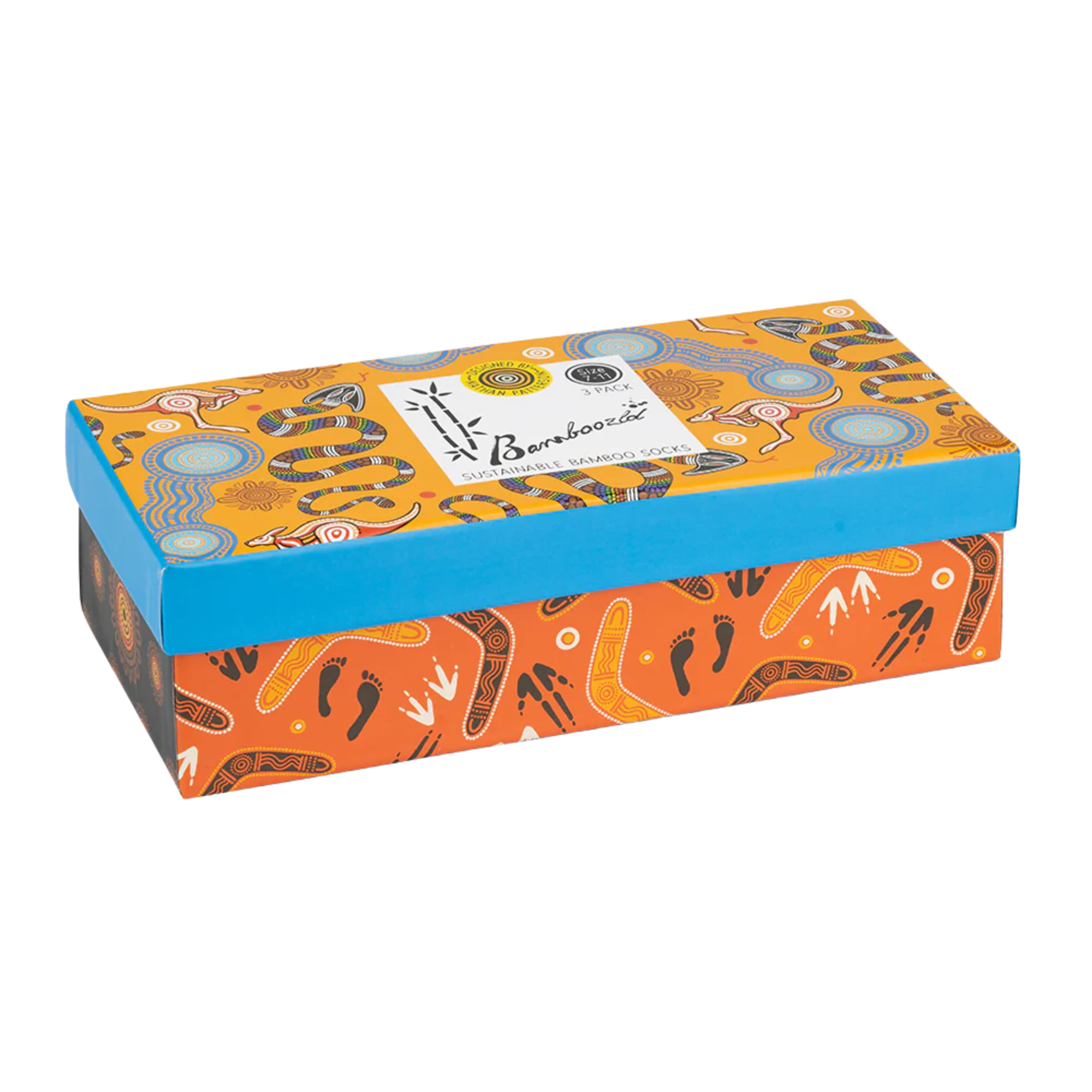 Designed in collaboration with contemporary Indigenous artist, Nathan Patterson, the Australian Dreamtime Gift Box of signature bamboo blend socks features Campfire, Rainbow Serpent, and Hunting designs, packaged in a stylish matching gift box.