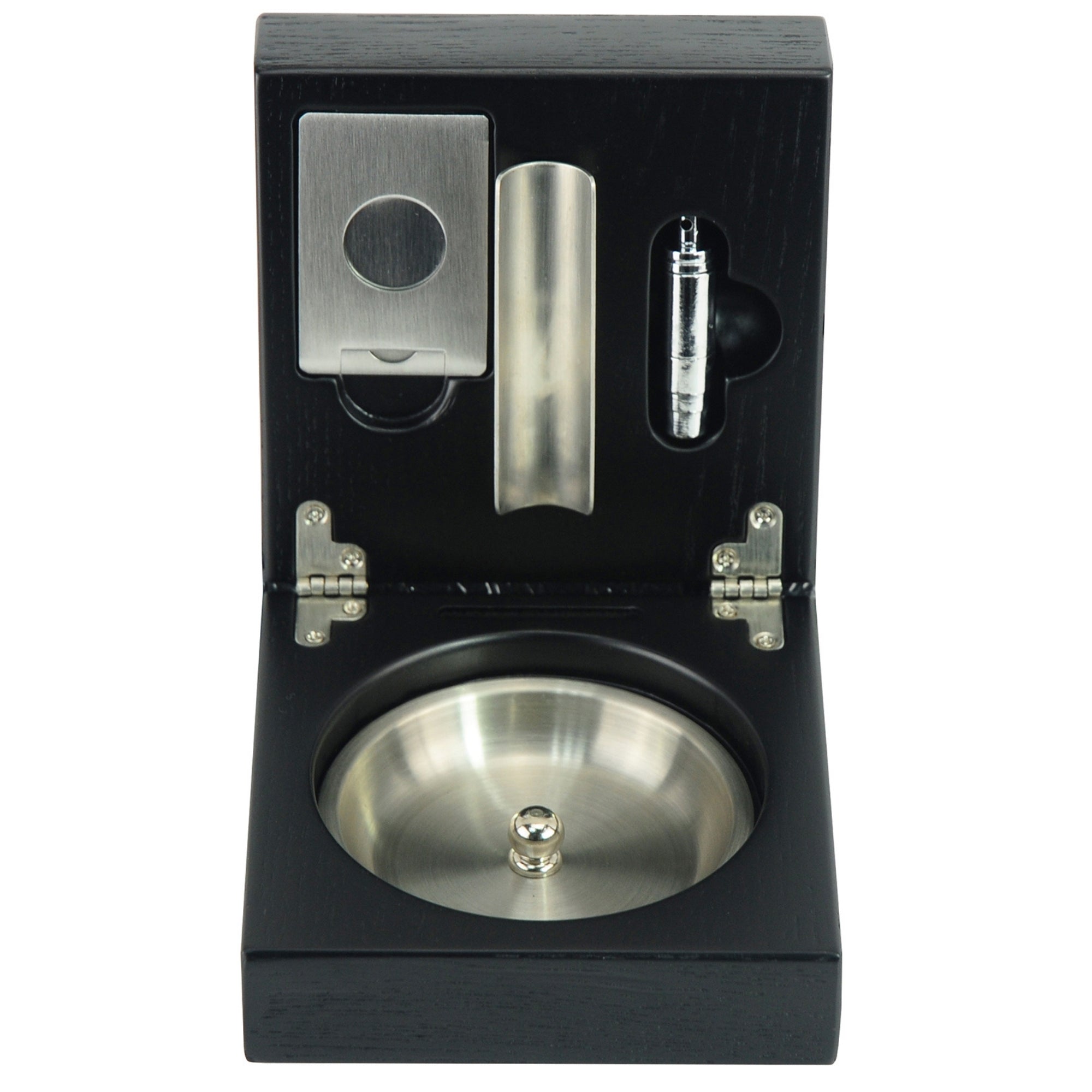Quick same-day dispatchIntroducing the Oak Black Wooden Foldable Cigar Ashtray with Cigar Cutter, this is the ultimate all-in-one kit for the traveling connoisseur. This smoking accessories set comes with a metal plate, a cigar cutter, and a cigar punch. It’s all neatly packed in a sleek oak black box with silver hinges, perfect for gifting or personal use.