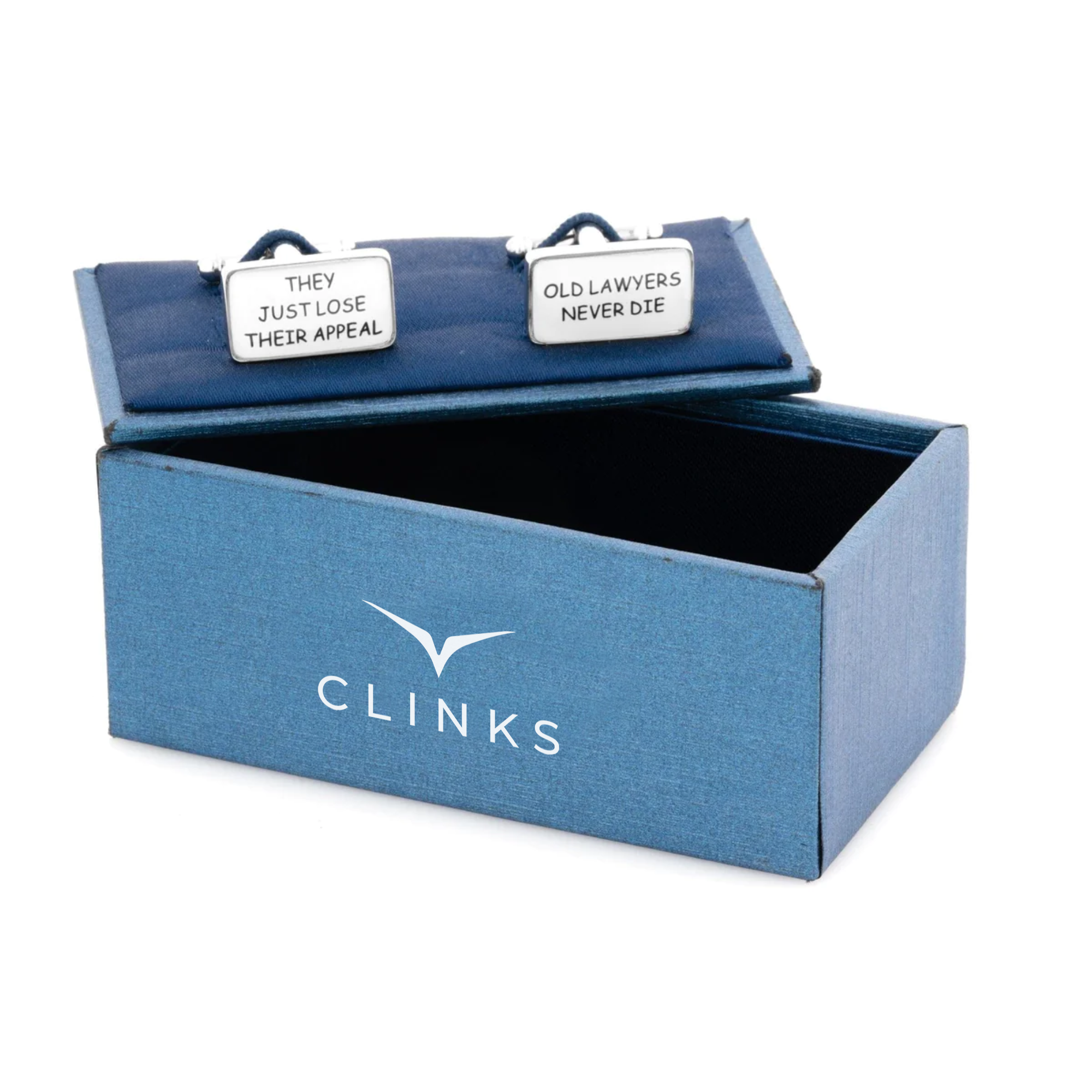 And who said stuffy old lawyers don't have a sense of humour? The set reads "Old Lawyers Never Die" on one side and "They Just Lose Their Appeal" on the other. This pair of novelty cufflinks is an ideal gift for that lawyer, judge, or attorney friend of yours, or anyone affiliated with the legal profession. They can be worn on ANY dress shirt with Shirt Cuff Adapters.