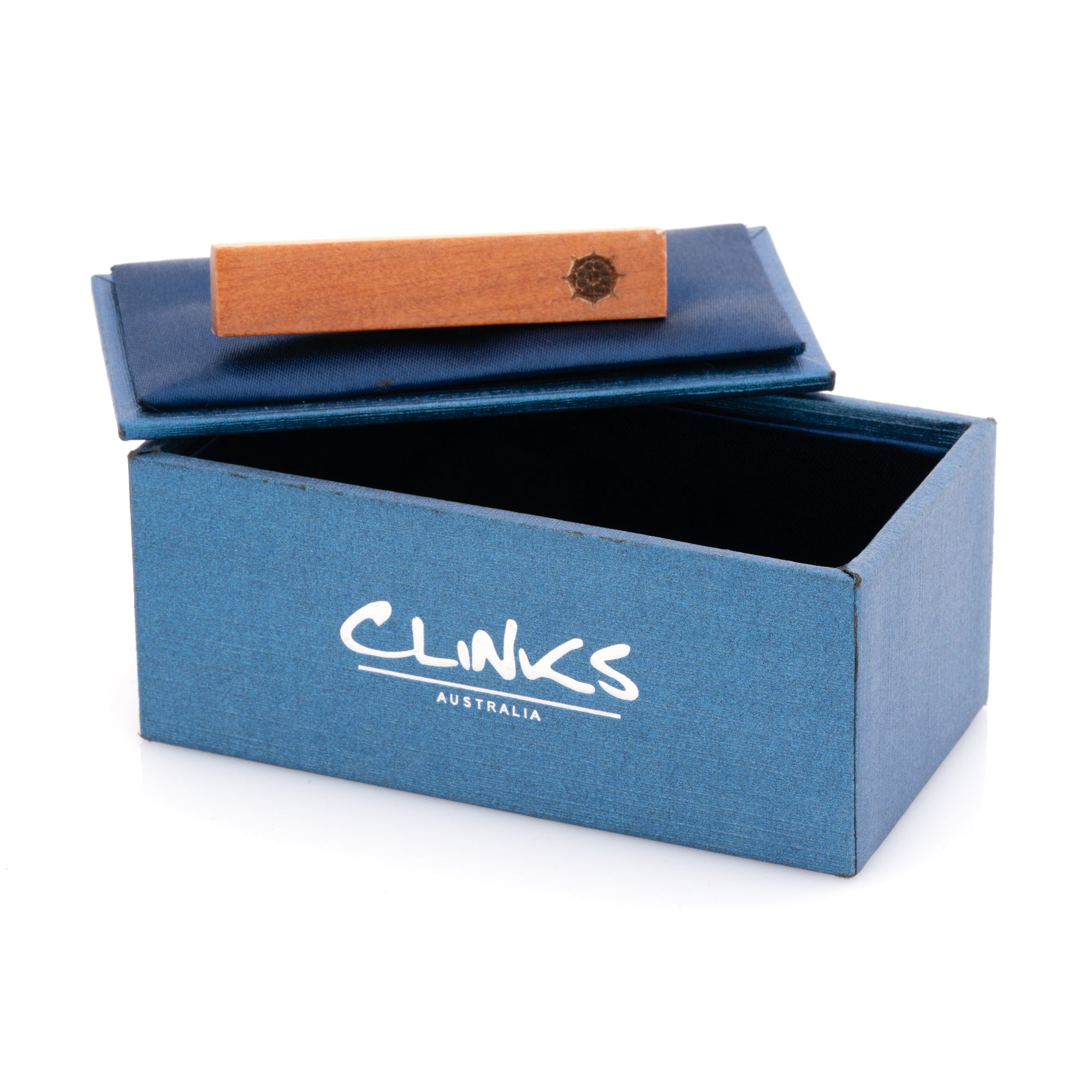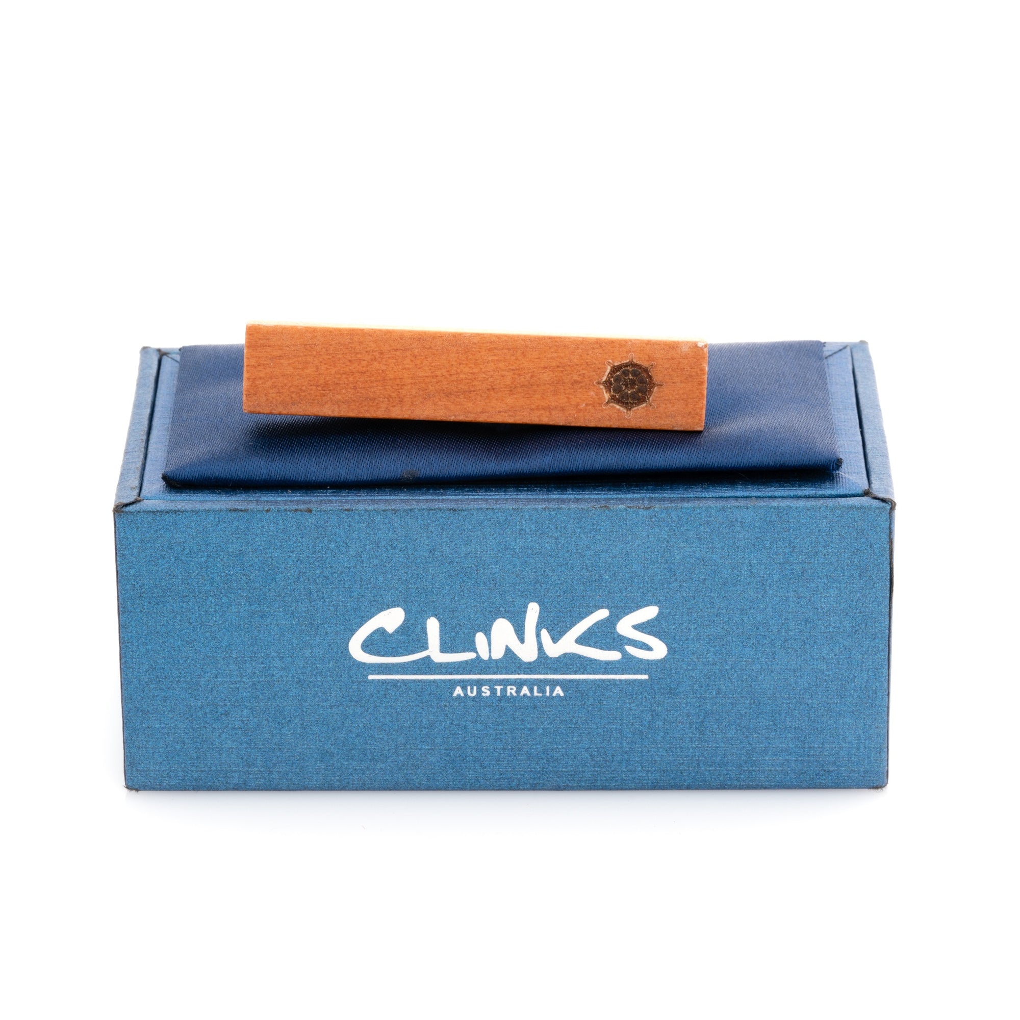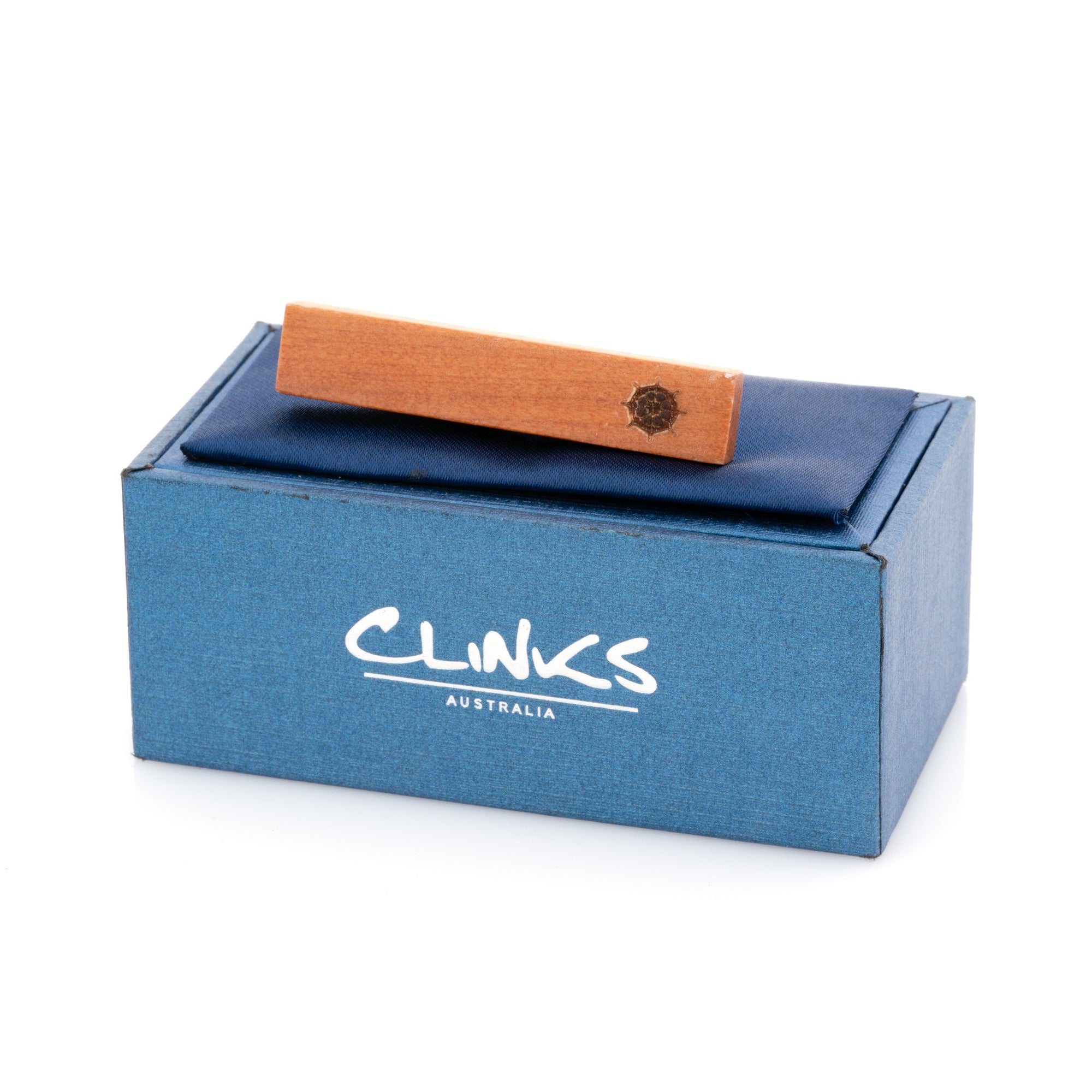 Comes in a stylish gift boxA trendy wooden tie clip featuring a small ship's wheel or helm stamp. A perfect gift for the lover of all things nautical. Comes presented in a stylish gift box.