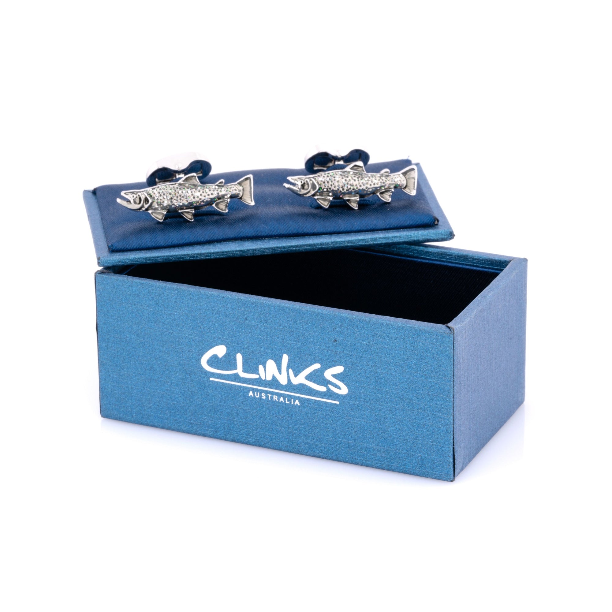 Comes in a stylish gift boxThese stunningly designed trout fish cufflinks are a sight to behold. They feature rainbow coloured scales which sparkle in the light. The photo simply does not do this set justice. A must-see to appreciate pair which will be loved by the avid fisher. Presented in a beautiful gift box.