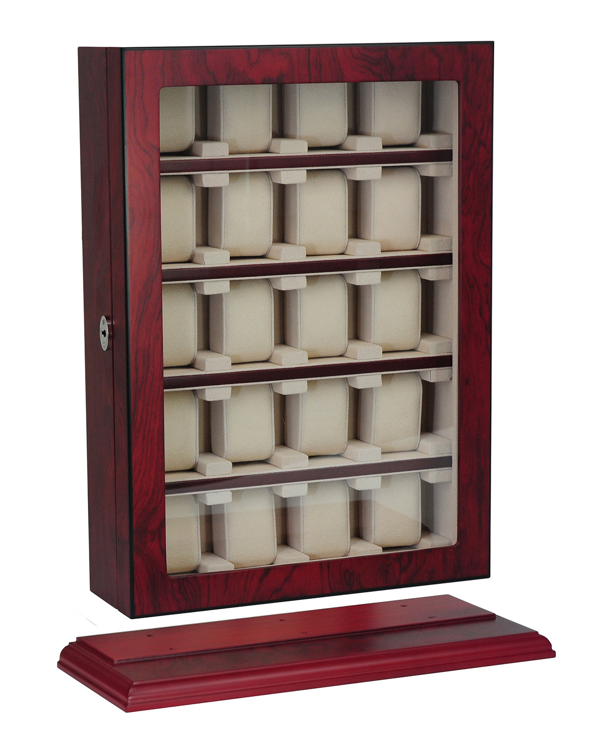 Introducing the new addition to our watch cabinet range perfect for up to 20 watches. This watch cabinet for 20 is made of quality timber and gloss brass hardware. Clear glass shatter-proof lid to keep your watches dust-free