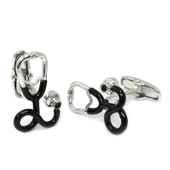 Comes in a stylish gift boxStethoscope Silver Cufflinks. Doctors wear suits almost every day, and these Stethoscope cufflinks are sure to get a smile from their co-workers and patients alike. These cufflinks feature miniature stethoscopes, finished in shiny silver and black enamel. These silver cufflink are very detailed and make for a perfect present for doctors, and those studying medicine or in the medical industry. Presented in a great gift box, and backed up by our money back guarantee.