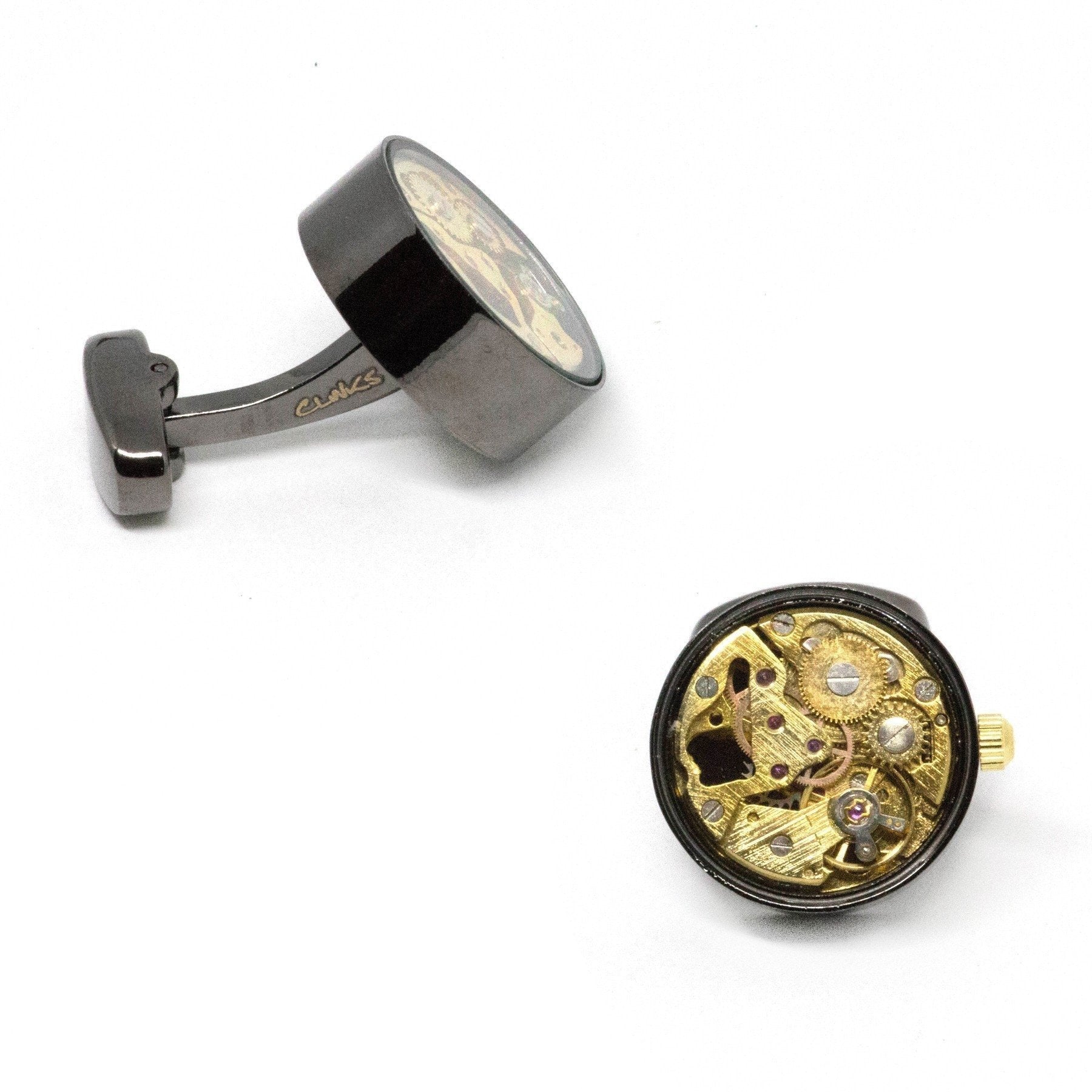 Comes in a stylish gift boxThese cufflinks are constructed from actual wind-up watch movements, which have been then placed into a specially designed cufflink casing. Winding the watch movement up results in the large gold wheel spinning in a backwards/forwards movement, while the cogs behind tick away. A great piece which really makes a statement with its cogs, levers and jewels. Wear engineering at its finest. These feature a gunmetal casing, with a yellow gold face and some rose gold cogs/wheel and with glass cover on top.